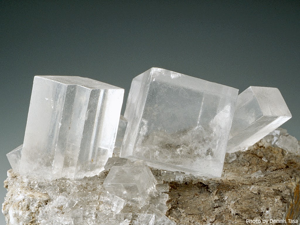 La halita, sal gema o sal de roca es un mineral sedimentario, el cual se puede formar por la evaporación de agua salada, en depósitos sedimentarios y domos salinos. Está asociada con silvita, carnalita y otros minerales. Su composición química es cloruro de sodio (NaCl). Sus cristales cúbicos incoloros prueban, otra vez, que Geometría y Naturaleza van unidos. AMJ